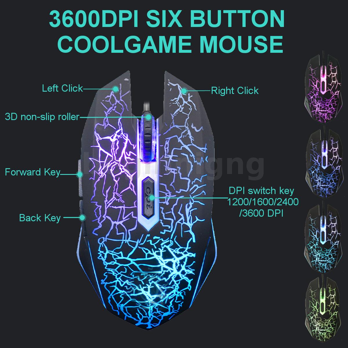 -- Gaming Mouse: Ergonomically Designed and Quality ABS construction; Durable USB wire; LED breathing light change automatically; DPI Adjustable: 1200/1600/2400/3600; Forward Key + DPI Key: Turn on/off the mouse backlight.