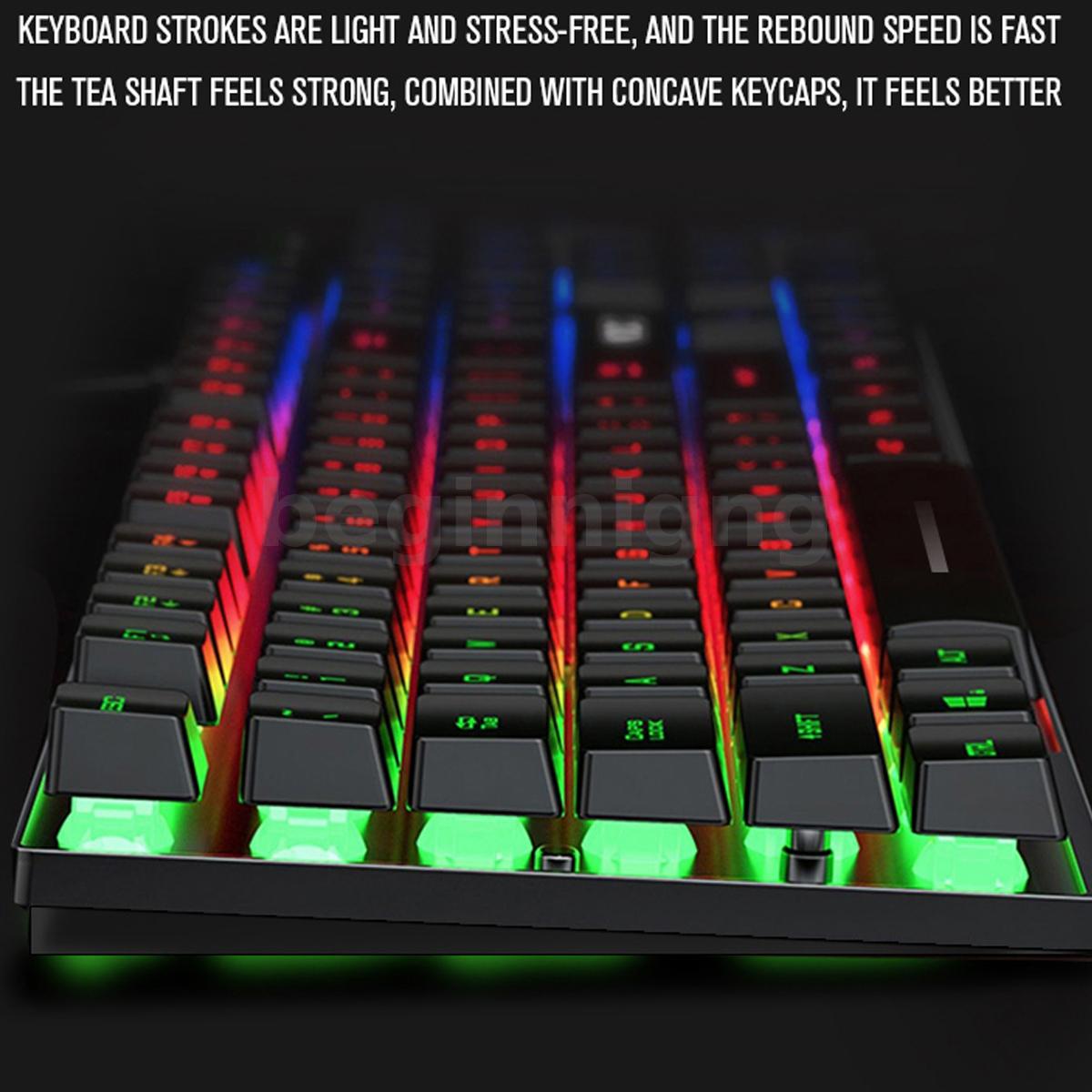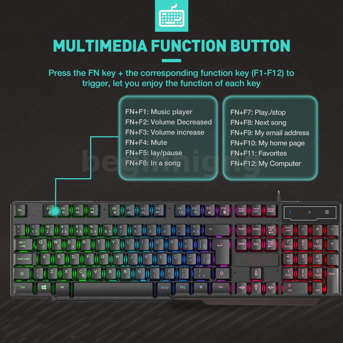 -- Gaming Keyboard: " Scroll Lock " Key: Turn on / off the RGB backlit.The 104 keys keyboard has rgb backlit function; All letters glow and never fade; This keyboard has built-in steel plate, anti-fall; Durable 61inch USB braided wire.19 Non-conflict keys allows you to press or hold multiple keys simultaneously.